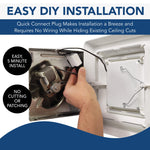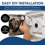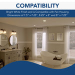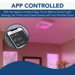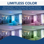 Maximize your early morning routines and unwind at night by enhancing your existing bath fan with the Broan-NuTone Replacement Bath Fan Cover, featuring the ChromaComfort color changing LED light and Sensonic Wireless Bluetooth speaker. This bath fan cover allows you to personalize the ambience in your bathroom with the color changing LED light and Bluetooth speaker to provide excellent crisp and bold sound with endless color and pattern options. From the convenience of your smart phone or tablet, you can easily customize lighting themes, adjust brightness, and set timers with the Apple or Android App while enjoying your favorite music, podcasts, news or audio books. Thanks to a quick connect plug, this DIY replacement cover can be installed in 5 minutes or less with no tools, no wiring, and no ceiling patching or cutting required, and it conveniently hides existing ceiling cuts. It's efficiently designed with fewer vent slots to stay clean longer, and the attractive bright white finish matches most modern white ceiling paints. This fan cover measures 10-1/4" x 9-3/4" x 2-3/8" and includes 2 sets of springs for use with multiple Broan or NuTone bath fan models including those with fan housing dimensions of 7-1/2" x 7-1/4", 8-1/4" x 8", and 8" x 7-1/4". The factory set PIN is 1234. Go to the ChromaComfort App instructions for more details.