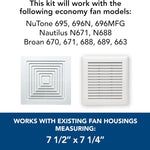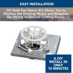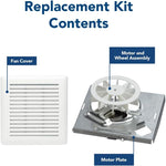 Instantly upgrade your bath fan in less than 10 minutes with the Broan-NuTone® BKR50SN replacement kit. Included in the kit is a 50 CFM motor and replacement cover. The BKR50SN is a quick answer to a bathroom exhaust fan that is no longer working properly, is noisy, or simply needs an upgrade. Install is easy and hassle-free with no wiring and no ceiling cutting. This kit contains Genuine Broan-NuTone replacement parts, guaranteed to fit. All parts are designed, tested, and certified to ensure your product runs at peak performance. Fits select models, check compatibility with your current bath fan.