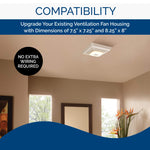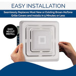 Broan Sensonic Quick Installation Bathroom Exhaust Fan Grille with an LED Light and Speaker is a unique lighted bathroom ventilation fan grille which allows you to upgrade your non-lighted ventilation fan or tired incandescent fan/light into a sleek fan/light with bright, efficient LED lighting and Bluetooth Speaker capability quickly and easily. This lighted grille is designed with fewer ventilation slots to stay clean longer and is a crisp, bright white to coordinate with today’s popular ceiling paint colors. Installation can be completed in 5 minutes or less thanks to a quick connect pass-thru plug. No extra wiring is required and the grille is sized just right to conveniently cover existing dry wall cuts for an easy, no cut install. Includes two sets of grille springs for use with multiple ventilation fan models. Grille dimensions measure 11" x 9.75" x 2" and is backed by a one year limited warranty. roan leads the industry with forward-thinking residential ventilation products, customized climate, communications and home automation solutions along with award winning customer service. Broan’s inspiring heritage provides the foundation for its three global brands – Broan, NuTone and BEST.