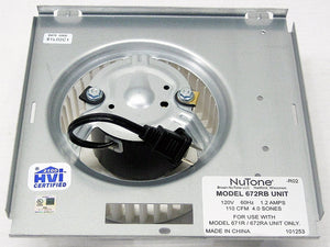 Broan-Nutone Fan Assembly. Stock Number S97017709.Motor and Blower Wheel is a Replacement for Broan-Nutone Bathroom Exhaust Vent Fans. Printed on the Metal Bracket is : Nutone Model 672RB Unit, 120V, 60HZ, 1.2 Amps, 110 CFM, 4.0 Sones. or Use with Model 671R / 672RA Unit Only.