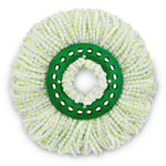 The Libman Green and White Tornado Spin Mop Refill has an extra-large premium microfiber head that is safe on hard floors surfaces. Durable enough to mop up tough messes, and can be used to clean virtually any hard-floor surface. The thick microfiber mop head thoroughly contacts your floor surface and traps dust, dirt, grime and messes. The microfiber head is machine washable multiple times. Spin Mop removes over 99% of staphylococcus aureus and E. coli on ceramic tile and wood floors when used with water. Microfiber is made of Polyester Polyamide.